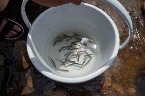 元気いっぱいのサクラマスの赤ちゃんを、組合員の方にバケツに入れてもらうと