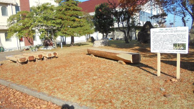 秋晴れの中新しく設置されたベンチが輝いています。どうですか、ビックでしょう。重さ600kgは優にあります。11月4日土曜日は、雨で予定していたお披露目会のセレモニーが外でできなくて残念でした。ネームプレートが見えますね、ニックネームは「大海ふるさとベンチ」に決定しました。たくさんのご応募ありがとうございました。