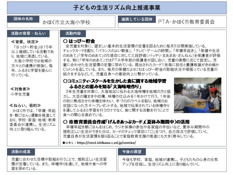 長年本校で取り組んでいる「はっぴ~貯金」、ふるさとの恵みを知る「大海味噌作り」、市教育委員会作成の「げんきあっぷカード」の活用の取り組みが評価されました。