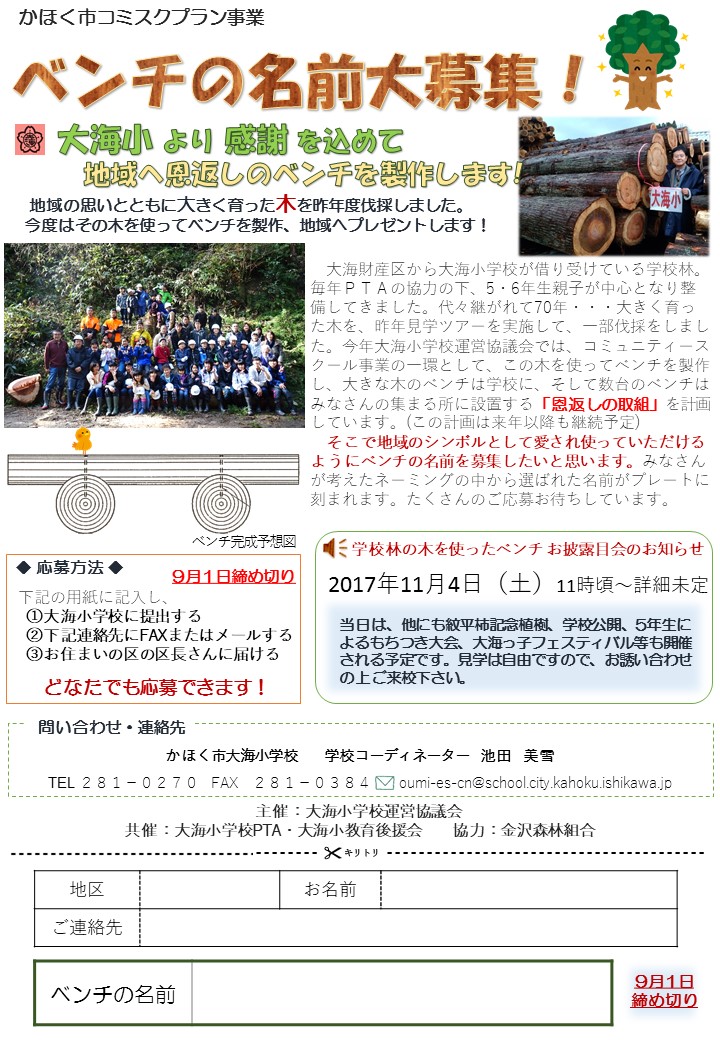 7月に保護者のご家庭だけでなく、校区全戸にチラシを配布しました。昨年「学校林」で伐採し、今年加工して仕上がるベンチの名前を募集するお知らせです。
