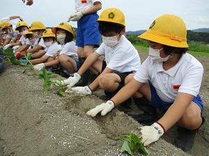 子ども達は一本ずつ苗を手に持ち、林さんに教えてもらいながら、がんばって植えました。