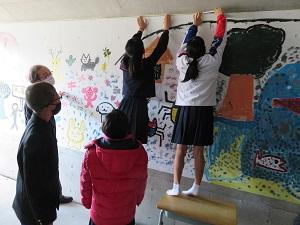 みんなで協力しながら、トンネルアートの上部に貼っていきます。