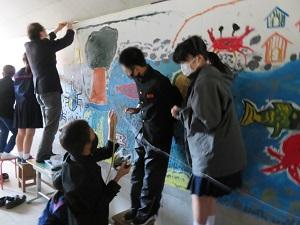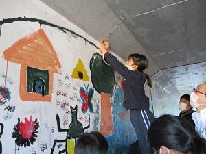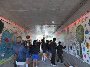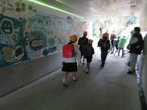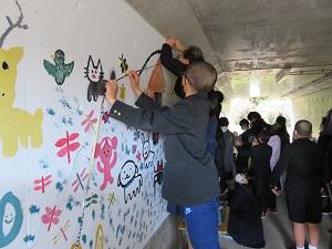 本校では9月に中沼交差点付近の縦断トンネルで「地域を元気に!」をテーマに5、6年生が壁面に絵を描きました。
