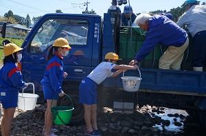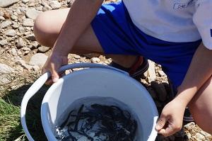 元気いっぱいのサクラマスの赤ちゃんを、組合員の方にバケツに入れてもらうと