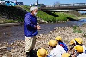 放流の後は、元漁協組合長の竹多さんより川と魚についてのお話を聞きました。
