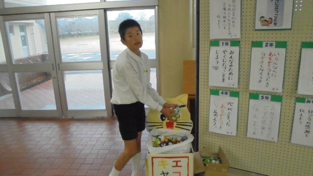 玄関のペットボトルキャップ収集箱が満タンになりました。4年生が作ったにゃンタロウの回収箱のおかげでしょうか。