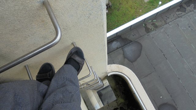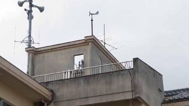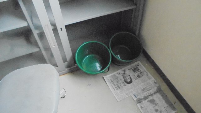 台風を無事やり過ごしたかと思いましたが、無事ではありませんでした。大きな雨でしたね。校舎の老朽化に伴ってか雨漏りが起こっています。点検するとプレイルームの物置、3階外ひさしに見つかっています。幸い子どもたちに影響のない場所なので応急処置を行い、様子を見ていきます。煙突のはしごを利用して3階の屋根を点検したときは、スリルがありました。(2枚目の写真)