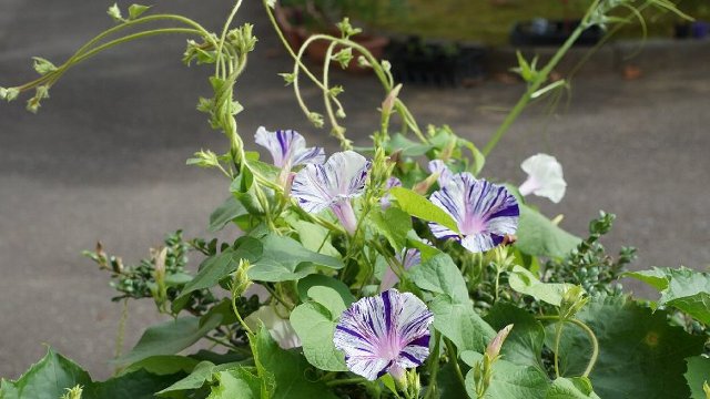 アサガオのツルが木を登って、それでもまだ勢い余って絡み合って・・・とにかくすごい事になっています。花も咲き始めました。宇宙からのアサガオの種を発芽させたものなので変異があるでしょうか。日曜日の奉仕作業の時ぜひご覧になって下さい。