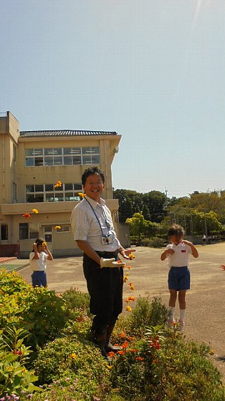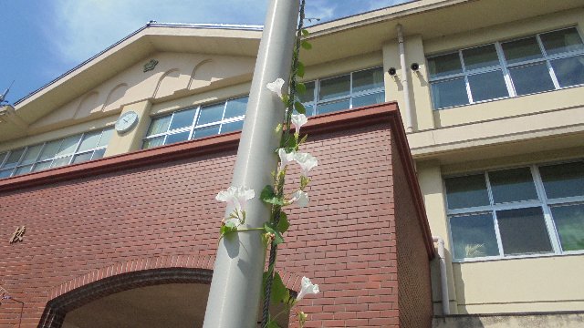 掲揚塔に巻き付いたアサガオは優に3mを超しています。伸びるもんですね。些細なことですがこんなことにさそわれ、子どもたちは外で草花に関心を示しています。