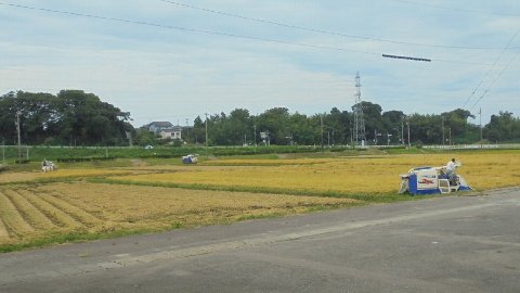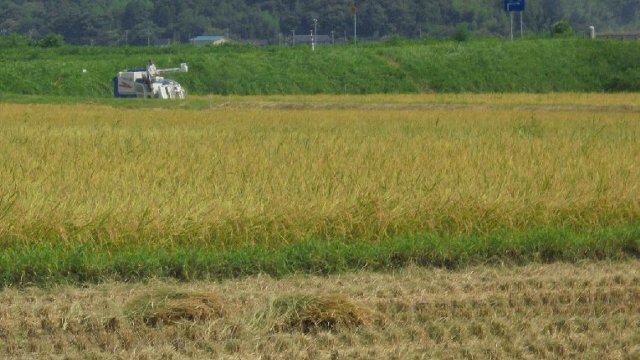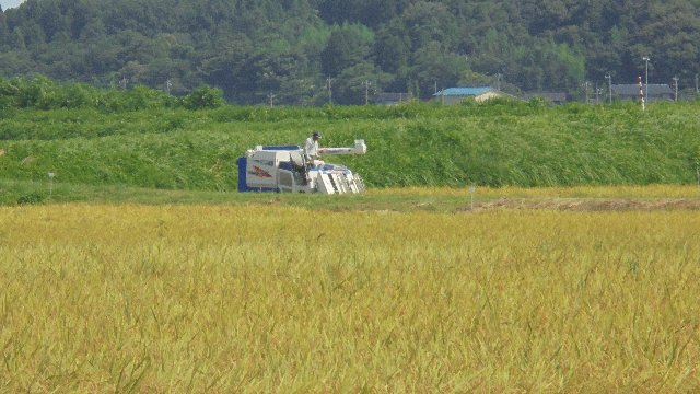 校舎から遠方を見ると稲刈りをする機械が動いている景色が見えます。1カ所の田に2台も入って刈り取りをしています。写真には3台写っています、見つけられますか。窓からはほのかに稲わらのにおいが漂ってきます。コシヒカリの刈り取りに入ったそうです。新米はもう食べましたか。