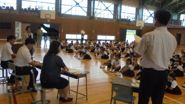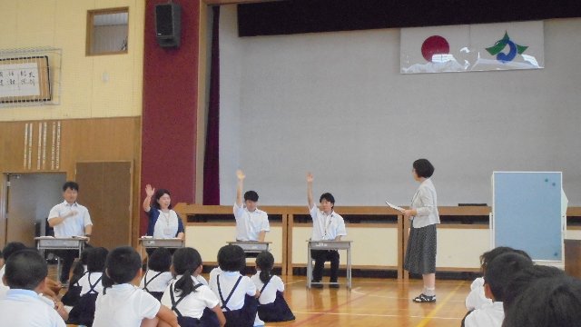 教員が全校児童の前で授業をしています。机といすを持ち込んで子どもの役も教員がしています。大海小学校には、「大海スタイル」という学習の約束・決まりがあります。ずっと続けています。夏休み明け、1~6年全校で確認して学習をスタートしました。学び合い、対話、深い学びを目指しています。