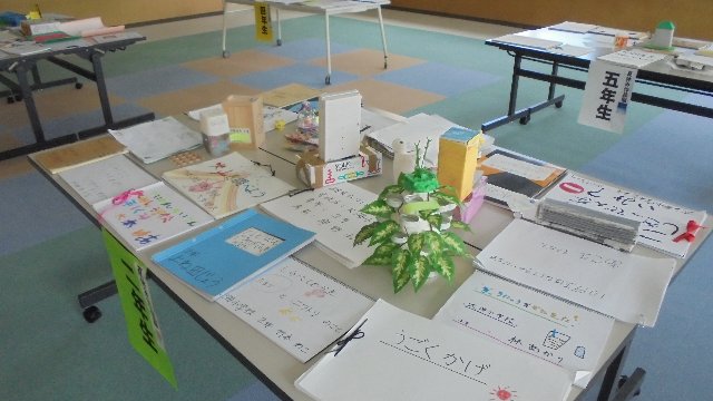 二日間の短い間でしたが、夏休み作品展においでいただきありがとうございました。この後、作品の募集先に送付します。たくさんの作品が入賞するといいな。このテーブルの中央の工作、大作ですね。みんなとってもがんばって上手にしあげていますね。