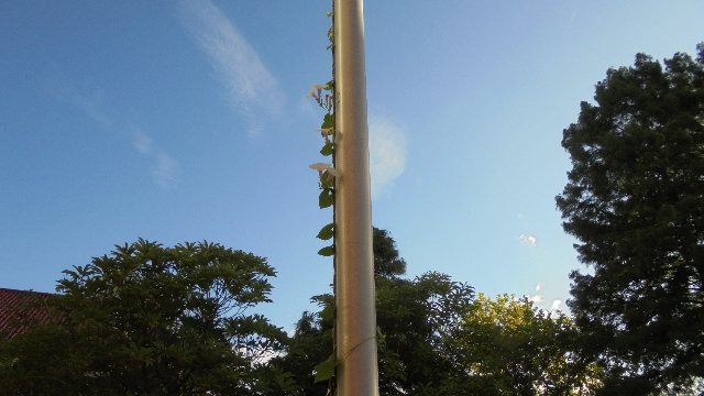 毎度「職員室からのお知らせ」というより「今日の学校の草花」コーナーになってしまい、大変失礼しています。玄関前アサガオがうまいこと旗の掲揚塔にからみつき、高く高く昇っています。花もたくさん付けてきれいでした。
