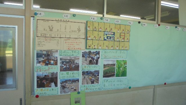 3年生教室前に「総合的な学習の時間」の学びの様子が一目でわかる大きな掲示が貼り出されています。3年生は総合が始める学年です。地域ふるさと学習を中心に味噌づくりや岡山の小学校とのフルーツ交流をします。