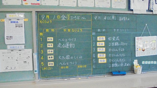 夏休みの間に各教室後ろの予定黒板が改良されました。教頭先生が2日分の予定がわかるように書き加えました。これで、毎朝次の日の予定に書き換えなくても良くなりました。とってもきれいになりました、ペンキ屋さん顔負けです。