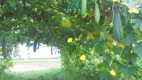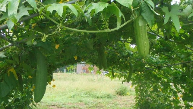 めっきり涼しくなり、夏の終わりを感じています。畑では、ヘチマが花をたくさん咲かせています。実もいつの間にかこんなに大きくなりました。こちらは1ヶ月前の様子。