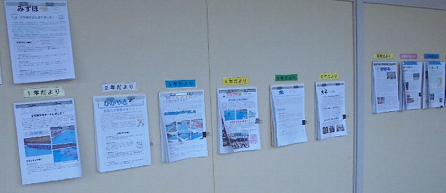 4年生は、調べて、まとめて、発表する学習を展開しています。すでに総合的な学習の時間で取り組んでいる大海川の環境調べは、リーフレットという形になって掲示されています。次は・・・楽しみですね。