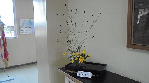 ボランティアグループ「いちご会」の皆さんが6年生を指導した後、となりの地域作品コーナーを見学して行かれました。玄関では今朝ちょうど生け替えた生け花も鑑賞して帰途につきました。こちらは細川さんの作品です。明日の新聞に地域交流コーナーのくわしい記事が出ます。