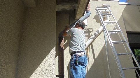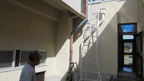 大海小学校の和泉校務士さんは、とっても器用です。たいがいの故障や修理は直してくれます。今回は体育館の雨樋の太い配水管が割れた部分を新しいものと取り替えてくれました。プロの設備屋さん顔負けの腕前です。