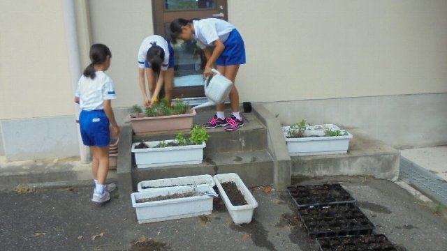 台風18号が接近しています。連休前に子どもたちにプランターの避難を手伝ってもらいました。6年生が力を合わせてあっという間に玄関奥へ移動してくれました。いつも最高学年として良く動いてくれます、ありがとう。ヘチマの実がブラブラ、これはどうしようもありません。運を天に任せて無事を祈っています。火曜日に報告しますね。