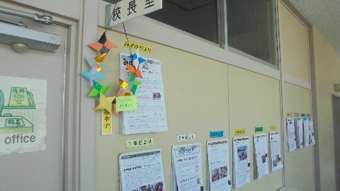 1年生の盛戸さんからプレゼントをもらいました。学校が休みだったときにお家の人といっしょに作ったそうです。あんまりかわいかったので校長室の入り口に飾らせてもらいました。