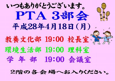 今晩は、PTA3部会が開かれています。 おいそがしい中お集まりいただきありがとうございます。
