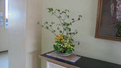 一つ目の話題は、職員玄関の生け花です。いつものようにボランティアのHさんが生け換えに来てくださいました。初夏を感じさせるすてきな花が子どもたちやお客さんの目を楽しませてくれます。