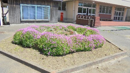 もう一つは玄関裏運動場側の花壇です。昨日まで草がたくさんはえてしまっていました。校務士の和泉さんが時間をかけてきれいにしてくださいました。中央の花がとてもきれいに咲き誇っています。