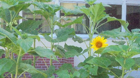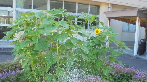 学校にはひまわりが数百本植えてあります。その中の一本が本日開花しました。周りを見ると次に続きそうなのが見当たりません。