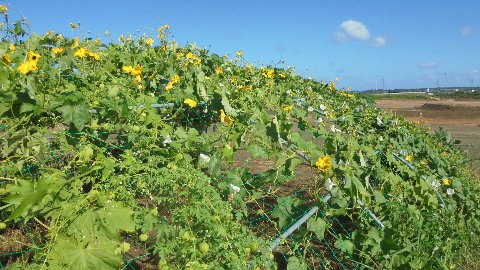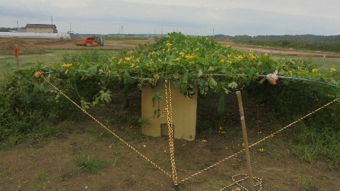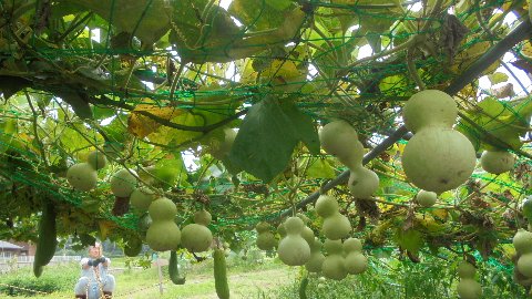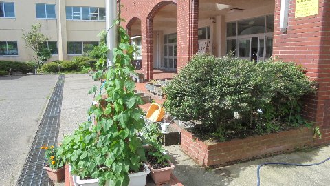4年生のヘチマといっしょにいくつか他の植物を植えました。せっかくの大きな棚なのでつる性のものを・・・アサガオ、フウセンカズラ、、千成りひょうたん、それぞれ実を付けてきました。負けるな、ヘチマ!