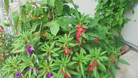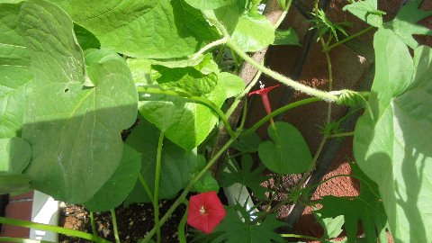 順調に伸びています。高さも2mを越しています。プランターなので水の乾きが早くて追いつきません。変わり種の花も咲いています。