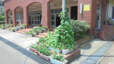 水はけが悪く、花を咲かすのが難しかった運動場側花壇がようやく花壇らしく?なってきました。中央のひまわりは3年生が間引きした時植えたものです。畑のものより一回り背が高い気がします。真ん中にケイトウ、日当たりがどうかな。これから楽しみです。