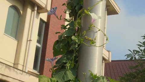 玄関の旗を掲揚するポールの根元で今年もアサガオを育てています。アサガオは高いところに伸びていきます。当然ポールに絡みついて・・・来校の折にはご覧下さい。苗は地域の方にいただいた変わり種アサガオを使っています。こんなかわいらしい赤い花も咲きました。