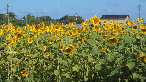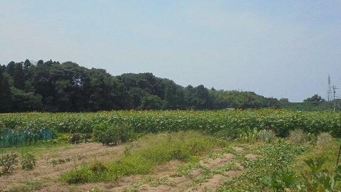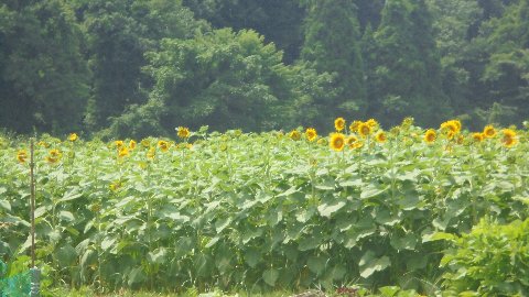 ここが元祖ひまわり畑です。夏栗の地域の方がボランティアで育てておいでます。ここから種と肥料を分けていただきました。まだ花は見当たりません、一斉に開花するときれいでしょうね。先日夏栗の区長さんが学校のひまわりを見においでました。学校も負けずに育てます。