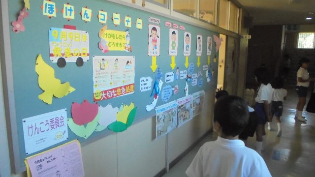 保健室前にけがの防止・処置の掲示がされています。早速たくさんの子が見入っていました。