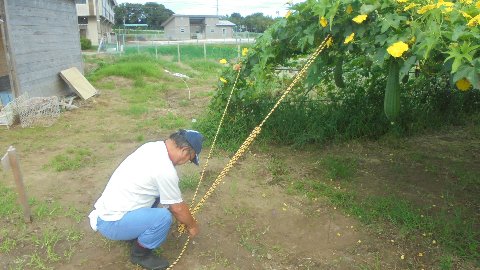 台風でつぶれたヘチマだな、持ち上げました。収穫までこの状態を維持したいものです。来年は何かいい方法を考えなければ・・・。