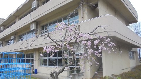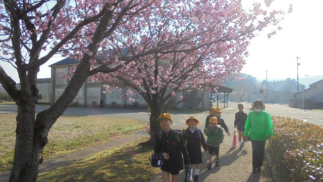 今年は、花の命が短くて・・・運動場はきれいな桜色になっています。交流館前の八重桜が咲きました!?こんなに早かったっけ。八重桜の下を歩いているのは、八野地区の子どもたちです。新入生が加わりました。遠くから元気に歩いています。