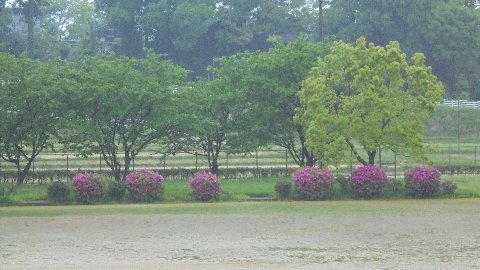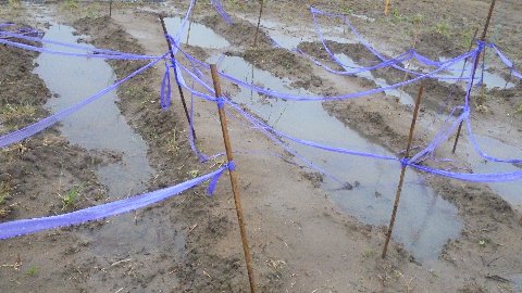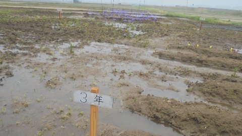 畑は先日の雨の時はこんな様子でした。水はけが悪く心配です。畑というより田んぼですね(笑)