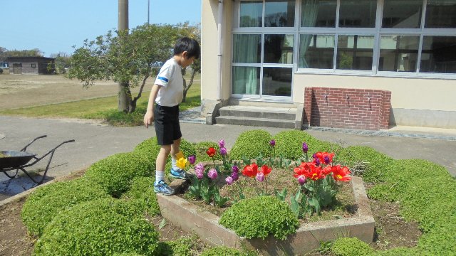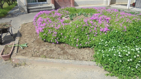 花壇が桜草とクローバーで盛り上がっています。運動場側は開けてあります。去年はホウセンカやひまわりが植えられました。今年はどうしようか迷っている内に去年落ちた種が芽吹いています。
