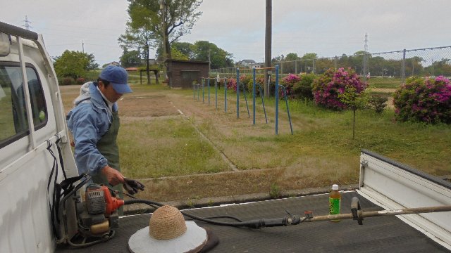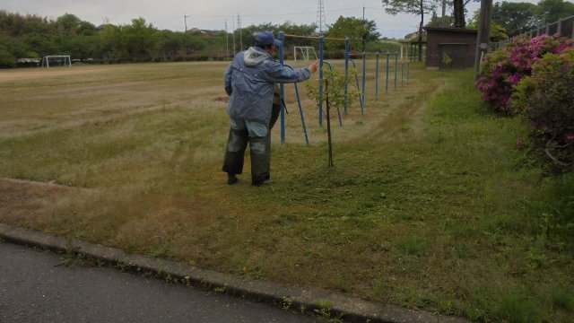 校地の草が伸びてきたので管理公社のみなさんに草刈りをしてもらいました。雨の中たくさんの草を処理していただきました。こんなときもふるさとベンチが役立ちます(笑)