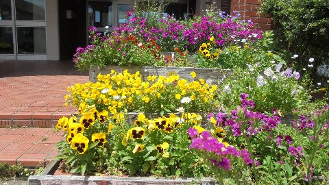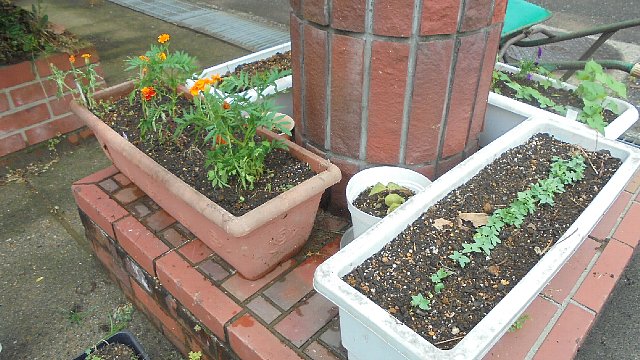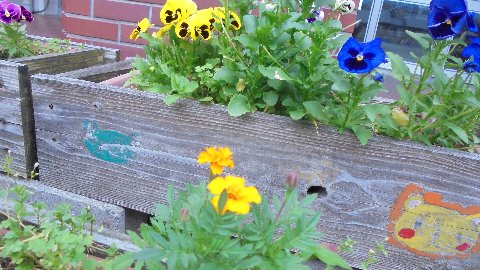 学校の玄関にも・・・植えすぎました。まるで行列です。(笑)マリーゴールドは子どもたちが去年の種から育てたものを一つにまとめました。もう咲いています。