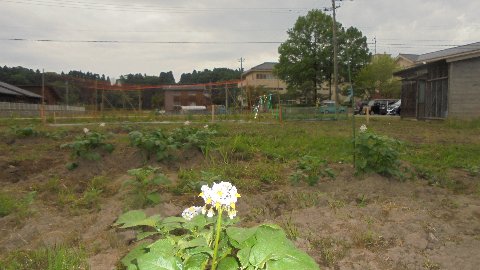 おそくなりました、ご心配かけています(笑)学校のジャガイモも、世間のものにおくれましたが写真のように・・・問題はどんな大きさのいもがつくかです。大いに楽しみです。