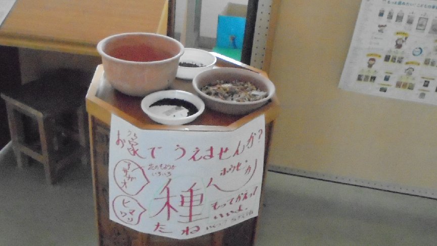 大海小学校では、栽培活動に力を入れています。いろいろな花や野菜を育てています。昨年種取りをしたものも使っています。たくさんとれたので子どもたちに分けました。持ち帰ったらいっしょに育てて、立派に花を咲かせて下さいね。