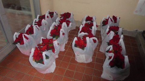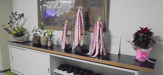 生け花ボランティアの細川さんが朝早くから来て下さいました。花にモールがかかっていました。同じ台にはポインセチアも。そして昨日のトロフィーが誇らしげに飾られました。