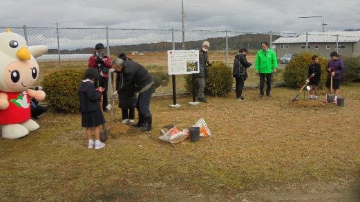 石川県の緑化推進協議会から植樹に対する補助指定をいただき、12月1日のふるさと学習発表会、ありがとう集会の後、地域の皆さんと共に行いました。補助金はスーパーマーケットのレジ袋を減らす取り組みから拠出されています。スーパーの「ハトッピー」というマスコットが来校し花を添えてくれました。森さん谷口さん準備ありがとうございました。