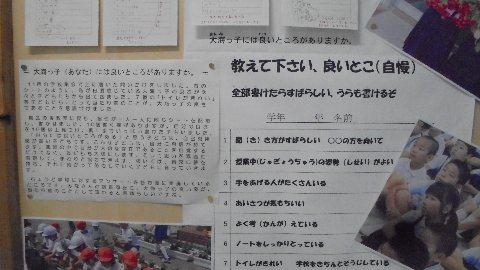 今月号の学校便りにのせた取組です。集会で話した後、子どもたちはたくさん自分には良いところがあるとカードに書きました。掲示にはっていくつか紹介してあります。