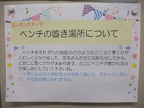早速、話し合った内容を区長さんに知らせました。区長さんの会議で学校林ベンチ『大海ふるさとベンチ』の行く先の参考にしてもらいました。週末から移設が始まるとお返事を聞いています。楽しみですね。