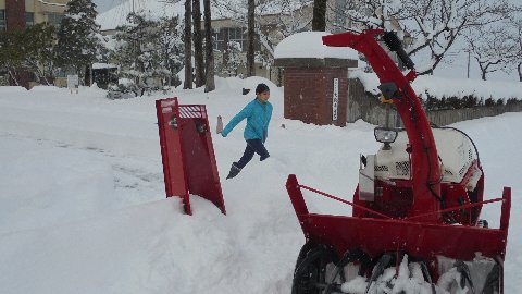 今回の大雪に際しても早朝4時過ぎより学校周辺を除雪していただきました。お向かいの谷口さん、区長の竹多さんありがとうございます。働き過ぎたせいかオーバーヒート、ベルトの破談で修理待ちです。先ほど修理完了、また除雪開始です。本当にありがとうございます。