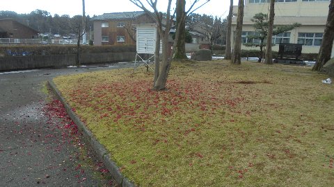 椿が今年も花を付けたらしい・・・大雪で満開を見逃してしまいました。今朝見るとご覧の通り。花びらがたくさん散ってしまい、惜しいことをしてしまいました。