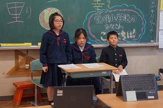 4限目に、オンラインで岡山県蛍明小学校3年生との交流を行いました。それぞれの学校の学習した内容(蛍明小:蛍について 大海小:紋平柿について)を発表し合いました。自己紹介や質問タイムもあり、楽しく交流できました。蛍明小の皆さんの工夫を凝らしたクイズ、元気のよい演技は大海小学校の3年生にはよい刺激となりました。蛍明小学校3年生の皆さん、ありがとうございました。